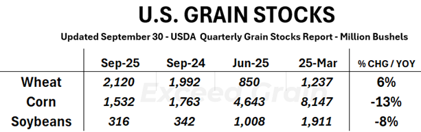 U.S. stocks report was released Sept. 30, 2025, prior to the government shutdown. Wheat ending stocks were raised 6 per cent year-over-year. Corn and soybean stocks were lower year-over-year.