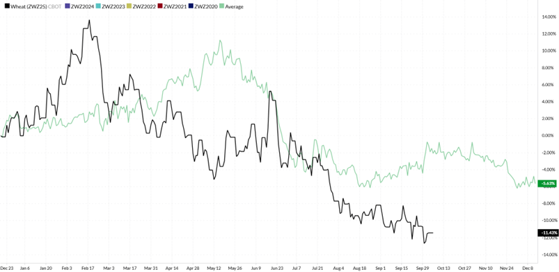 Seasonal Charts – Chicago Wheat – Average (Green Line) Current Year (Black Line)