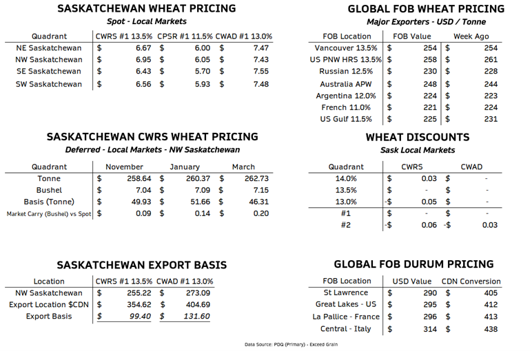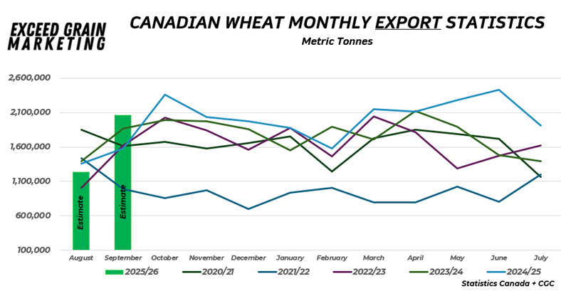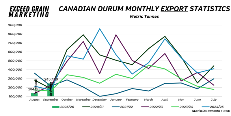 Canadian crop size has been increasing as producers wrap up harvest with Statistics Canada estimating the crop at 6.5 mmt up from 6.1 mmt in the August estimate. The crop size is larger than last year’s total volume. Global import demand is expected to drop from 9.2 mmt last year to 8.6 mmt this year, larger global production being penciled in at 37.2 mmt vs last year’s 36.4 mmt of which Canada will account for 6.5 mmt of that. EU crop at 8.3 mmt vs 7.2 mmt last year. Ending stocks, this year are expected globally at 7.5 mmt vs 6.7 mmt last year and Canadian durum will need to be competitive. Early exports of Canadian durum have been strong and are pricing well into EU and North Africa. We are watching this trend closely and keeping an eye on export shipments in a proactive manner to analyse the movements.