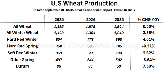 The Wheat Production Report was also featured on Sept. 30, 2025. All wheat production was up, and durum tonnage was up 7.5 per cent year over year. Hard Red Spring Wheat is down 9 per cent while winter wheat classes rose in production.