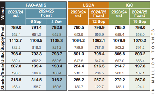 In its October Market Monitor, AMIS increased global wheat production by 1.5 million mt from its September forecast. The increase in production was the result of larger production in Australia and Ukraine offsetting smaller crops in the EU.
