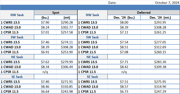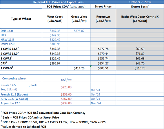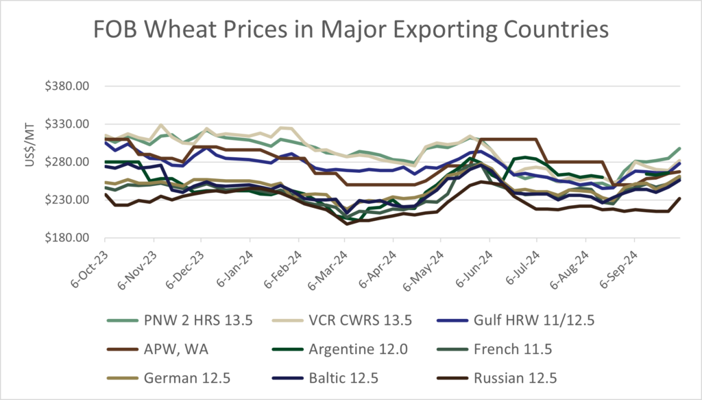 We have Russian FOB values for 12.5 per cent protein wheat for Nov. 2024 at $232.00/mt (up $9.00/mt from last week).