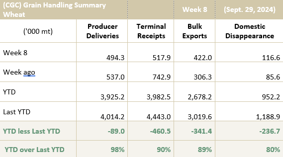 Canadian exports were strong in week eight at 422.0k mt, but total exports are now 11 per cent behind last year at 2.7 million mt. The average seasonal pace to date is 334.8k mt per week compared to the average pace of 406.2k mt per week needed to meet the AAFC’s 20.55 million mt export estimate.