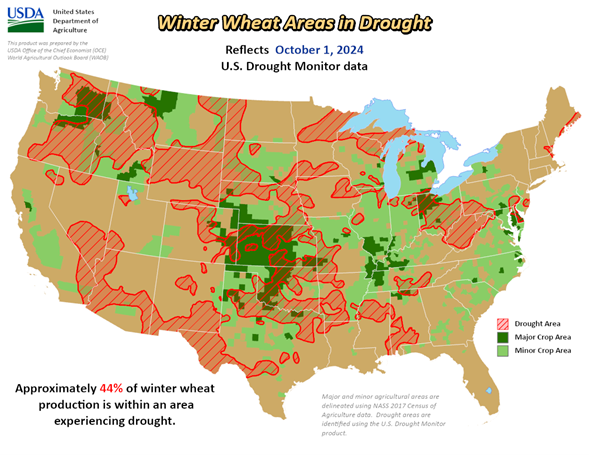 Winter wheat seeding advanced 14 points over the week to 39 per cent complete. The winter wheat belt remains dry. Approximately 44 per cent of the total U.S. winter wheat area is under drought conditions. Fourteen per cent of the crop has emerged, which is slightly ahead of average. USDA has not begun condition ratings yet.
